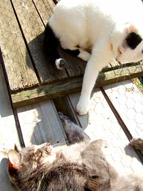 珍しい接近、こちゃとさすけ。外扉を開けっ放しなので、弱った蜂がしこたま部屋に入ってくる。と、みんな持ってくる。 てつが持ってきた蜂をさすけが貰ってさんざん遊び、ぶんっとしたらこちゃの傍に。とりあえず1分程2匹で雁首そろえて見ていた。最期はさすけがこちゃを叩いてこちゃが唸って・・終わり。 客人は名古屋に発った。我々は1階中庭植木切り。元菅又は来週仕事準備。 午後遅くに資材材料買いに与野ドイト。しこたま。5軒分? といった普通の1日。 《グリム兄弟》と《コ〜プスブライド》観たいんだけど、映画の日とか女性1.000円の日とか祝日ばかり。 グリム童話よりもアンデルセン童話の方が好きだが。 小さい頃むちゃくちゃ読んだので、題名や作者もわからない話がいっぱいある。ちょっと残念。《水の子供》とか中国のロバに変えられてしまう蕎麦の話とか・・。夜の月明かりの中で自分の影がだったか月だったか・が怖いのはアンデルセン? 昼・昨日のナンなど、夜・・・ま〜た元菅又がナンを買ってきた・・。半端飯め。 【菅又の一言】・・・《寝ている儂の顔を叩くな。》 だい猫が早朝きゃ〜きゃ〜云いながらべしべし叩いている。シュ〜ル。 |