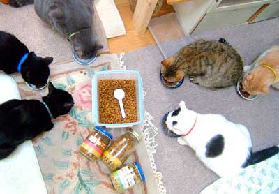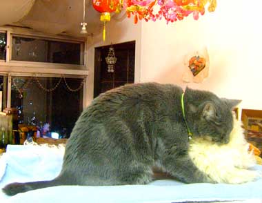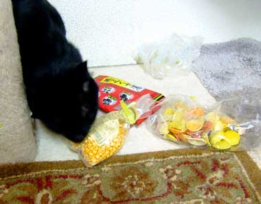 昨夜遅くにカレンダ画像を仕上げていたら、龍う太が獲物を。使い掛けのレンズ豆とか、使い掛けのパスタとか・・・新品黒豆葛湯袋。 台所の高い棚からと下段の棚を開けて、う〜う〜唸って、でも嬉しそうに持ってくる。 歯を立てて穴を開け、中の匂いをかいで、また新たな獲物探索。 そのたび作業を中断して見に行くわけだ。ひどい事になっていなければ放置。仕舞うとそれを見ていて、またすぐ出してくるから。お利口。 登り棒の下に溜め込んでいた。カリカリをやって気を逸らし、ちょっと《ちゅうちゅう》をして・・。 龍う太は中身を確認したらすぐ関心が無くなるのでよいのだが、問題はその後。さすけはばりばりに破く。ひたすら破壊が楽しい。 ってことで、みんながカリカリを喰っている間にとりあえず電子レンジに隠したわけだ。 元菅又はひたすら店改装、田崎はカレンダ印刷しつつ作り物。いや、実際はなかなか自分の作業は進まない。店に行って床材を塗るとか、洗濯物を取り込んだり干したり、カリカリやったり《ちゅうちゅう》投げたり、いじめの仲裁したり。カレンダ紙は厚手なので一度にたいした枚数はプリンタに立てられない。印刷は早いし、しょっちゅうしょっちゅ差し込みに行かねばならぬし、それらの隙を縫って編み物縫い物。 昼・カップ麺、夜・貰い物の巨大な美味しい牡蛎鍋と鰺丸干しと飯と和みセット。 【菅又の一言】・・・《携帯は予備部品と化した。》 ふn。年内中は買わんでいいな。儂のを使え。 |