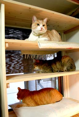 新しい寝室猫棚で。こちゃ対策で低くて上がりにくい棚・・。尻尾が上がらない高さ・・・。 実は一つ問題が・・。2段目3段目の窓側隙間から下の猫を叩ける・・。 互いに叩きまくって困ったものだよ。 遅起きして、駐車場で弁当を喰う男に注意とか休日なのにうるさいラ〜メン屋に文句とか・・。来週のスケジュ〜ルを組んであちこちに打ち合わせ電話。 自宅作業の打ち合わせと買う材料のチェック。 しっこ対策。・・・・・・・。 ちょっと怒った田崎は(毎日洗濯・臭い・面倒)・・寝室も隔離部屋にしようかと考える、1ヶ月に1回は考える。でも菅又は可哀相というし。有能しっこシ〜ツも大量入手だし・・・がんばる。物を床に気軽に置けない、壁面も一切信用できないのが辛い。あらゆる事を考慮しながら生活せねばならぬ。 田崎は少し庭仕事をしていたが、蚊・・蚊蚊蚊蚊・・蚊まみれ。がぅ。猫も龍う太以外あまり出てこない。つまらない。蚊〜〜〜。 先週借りてきたDVDでTV版《ポセイドンアドヴェンチャ〜》観た。最新映画版より全然面白い・・。前半は特に面白い(前編後編3時間もあるから見がいがあるのだ)。ポセイドンアドヴェンチャ〜とグリッド(テロ物)を混ぜたみたい。後半は若干失速したが、顔ぶれも豪華だった。映画は何だったのだ・・・とまた怒りが。 田崎髪は・・・外出時は帽子を被っていたが、どうもイマイチしっくり来ない。オレンジのはずが生え際が赤すぎ(赤いのは嫌い、日本人の顔色にあまり似合わないと思う)。 先日美容院での話題、最近は男女ともみんなちゃんと美容院で毛染めするそうだ、だから汚い髪が減ったのね。自分で染めると髪がすごく痛むらしく色むらとぱさぱさばさばさ。田崎は前髪を色抜きするだけだったので平気だったのだが。毛染めは高いがお洒落とはそういうものだだだ・・。 と云いつつ自分で前髪の色抜き中。先日の宴会客人の金髪ソフトモヒカン・・格好良かったなぁ。いつかそのうち・・。 しかしどこかは年相応の物を残しておかないと、自分で若いつもりになってしまって醜いからね。・・・白髪〜田崎。 逆に若いのにすごくおばさんくさい人が増えた。実年齢が若い/若くない、気持ちが若い/老けている、身体が若い/運動不足で虚弱/年寄り、精神が若い/おばさんくさい/老成、その組み合わせによってもの凄く違う。 昼・自家製トマトとバジルでピザ三昧/田崎が作った/とキャンベルス〜プ、夜・雑穀飯と牛肉野菜のニンニク味噌たれとオクラ納豆と自家製紫蘇胡瓜揉み/菅又。 【菅又の一言】・・・《裏の現場は本当に潰れたみたい。》 期待するな。 |