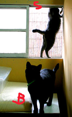 これは昼飯を食べようとしているところ。勿論、すかさず、当然・・てつは田崎膝。 毎日飯を喰うのがあまり楽しくない。『いただきます〜』と云った後にため息。ご飯は冷めるし、食べる勢いがなくなってしまう。美味しいから食べてしまうが。 てつはあちこちうろうろわぁわぁ。ちょっと甘やかしたものだから図に乗って大変。 美味しい(身体に悪い)カリカリをくれくれ、肩に乗って外に散歩に行く行く、我が儘三昧。 傷が治ってきて痒いらしく、しょっちゅうかしかし掻いている。プラスティックを掻く音が響き廻っている。そのたびに田崎は肩抱っこをして紛らわせているのだが、重い。ああ〜重い。 今現在、田崎足元でう〜・・ううぅぅ〜と小声で文句を云っている。困ったねぇ。 菅又は中庭作業を進めている。 田崎は漢方と、明日で高田馬場の診療所を辞めて遠方で開業する心療内科の先生に睡眠薬を貰いに。殆どいらないのだが、安心料としてまだ手元に欲しい。らりるれろ。 macのあまりの不調に、入れ直しをするぞ。と、思い立つ16時。表紙に書いた16自壊し・・・おや、また阿呆変換している、16時開始。しかしだ、行く手は難儀だらけ。250GBの外付けHDDにバックアップしようと思ったら、USBだ、遅いだめだ、これはWindows用だった。ではWindowsについているのと交換だ、そこに入っている中身を焼くとか移動とか2時間。 くそ、macったらFireWireを認識しない。遅いUSBで繋いで、ちょこちょこ。うんざり。内部にもう1個/120GBのHDを入れてある、そちらに全部バックアップはしてあるが、やはり一応外部に待避したいではないか。諦め。 更新が終わったらOSXを起こして(普段はOS9だ・デュアルだ)《物理フォ〜マット》だ。待ち時間は昨夜に引き続き80GBHDD2個分のデジ画像をDVDに焼くんだ。大嘘、借りてきた《マインドハンタ〜》観る。 ・・・・・。頭の中は、どおどおと・・流れる《DOOM/GAME)》の地下水のような、フォ〜マット後の再インスト〜ルの事。がああああああ。 昼・パンセット、夜・雑穀飯とぶり刺身と牛蒡蓮根豚肉炒めと水菜サラダ。 【菅又の一言】・・・《モルタルの上を歩いたのはさすけです。》 PS・USBメモリって実はかなりお利口、256MBも入る。このHPバックアップはこんな小さな物に。ちょっと感動。 今からがんばる。(更新中に2度も固まるGoLive・・末期症状の儂mac。)