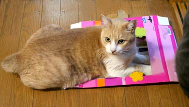![]() てつは偉いなぁ、潰してあっても箱はすぐわかる。 無理くそ入ってみる。 でも顔はちょっと・・んんん〜〜っとしている・・。 |