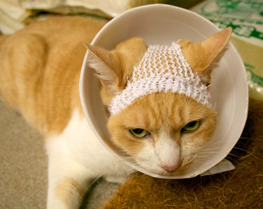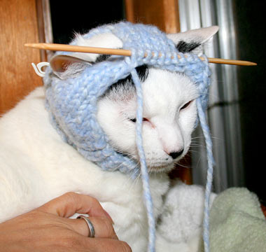 ![]() てつの傷被い用帽子の試し編み。 さすけに手伝って貰い、やっちで試着。