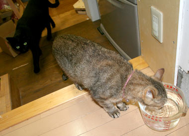 だい猫は風呂場の中で、ぬるい湯を飲むのが好き。最近肌寒くなって風呂の猫扉を開けていないので、前に座ってしぶとく自己主張する。どうせ入ったって夏じゃないんだから湯どころか冷たい水じゃ。 放置していると、怒ったりする。ああ〜面倒だと、試しに風呂外の常設猫水飲みボ〜ルに湯沸かし器の生ぬるい湯を入れたら、しばらく文句垂れていたが、飲んだ。 こうやって猫はどんどん我が儘になり、人間は奴隷化するわけだ。 後ろに順番待ちはぶんたろ〜。彼は他の猫のケツの匂いを嗅ぐのが趣味。みんなにすごく嫌がられる。だい猫にも平然と。以前に比べれば、だい猫はみんなととってもなじんでいて良いことだ。 菅又は家中のすだれ外し、よしず外し、崩壊した物は細かく切ってゴミに出す準備。屋根の上に全面的に掛かっていたよしずなので、膨大。 各所にうち合わせ連絡、決定した物の発注注文、作業日の決定打ち合わせ、壁紙屋と連絡など、多忙。 夜久しぶりにわぁわぁ逃避とん久、本屋。 昼・卵かけご飯セット、夜・とん久いつものセット。 【菅又の一言】・・・《新鮮なカリカリなら喰ってやらんこともない。》 これは、だい猫のこと。新鮮(毎回瓶から出したて)いっぱい(飯で云えば『最後の一口』になると足りない)が必須。要求が聞き入れられるまで、座って眼力飛ばし。 -------------------------------------------------- 【今日のてつ】・・・・昨日騒ぎまくり外に出まくりだったので、割と静か。雨だったし。わぁわぁしないと云う訳では全く無い。飯時に膝に乗らないと云う訳では無い。