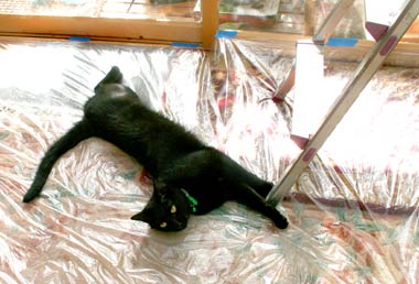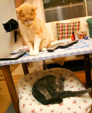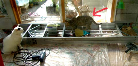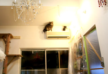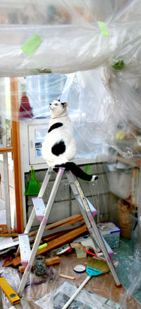 やいちの横顔はおばさんっぽい・・。頬が下がって顎がぽよぽよ・・顎なし。 まったく人間と同じじゃn。 つまりそれは田崎さ。 実は寝室で日光浴中、暑くてうだっているところ。 菅又はひたすら壁作業。あらゆる所をビニ〜ルで覆い、上から降ってくる何十年前の埃を除ける、避けたい。避けれ。おい! ごほごほ。 結局大仕事になった。下がり壁を取るだけではなく、南側の壁全面撤去、屋根の斜め勾配を全部見えるように。 下がり壁を支えていた柱は、実は中空に浮いている。また半端に壁をいじるよりも、いっそ全部撤去した方が楽、明るい、部屋が広くなる・・・等等で。 将来的には正面壁・ベランダ上にも窓が開く。 部屋の中から空が少しでも見えるといいのぉ。 裏の新築工事の全貌が見え始めたので、ようやくあちこち本格改装が出来るようになったのだ。むこうの2階正面に窓がある、寝室は結構見えると思うが、居間はベランダ植木がわさわさあるし、殆ど影響ない。向こうの3階正面には窓なし。やた〜。あとはくそうるさく無いことを。 田崎は諸々雑務。 しかし部屋の出入り口、あちこちの壁、あらゆる所にビニ〜ルがでろでろ掛かっているので、移動はとても大変。猫たちは、嫌がる猫と開 けろと要求しまくる猫と、まったく関係なく普通に通る猫と。臭い苦しい。 夜20時に秋葉原に菅又の予約していたDVDを受け取りに。予想通り店頭には一切在庫無し。 で、今日の菅又は、やっぱりお馬鹿。いらぬ事をしてどつかれ、・・・・・・菅又デジカメ(旧田崎カメラ)を脚立の上から落として壊した。必要ないのに何故そんな所に持っていく。 近所のWindowsサポセンは無事成功。 昼・先日の残りのナンカレェセット、夜・雑穀飯と牡蠣鍋と茄子生姜焼きと塩鮭とアシタバと舞茸味噌汁と和みセット。うぷす。 【菅又の一言】・・・《あ〜液晶が割れた。》 |