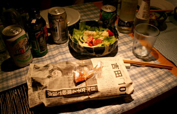 先週に引き続き宴会、総勢7人。 店で騒いだので通行人から営業しているのかと聞かれた。 渋い新聞包みはお土産の《新橋の焼き鳥》、唐辛子付き。 |