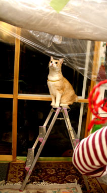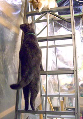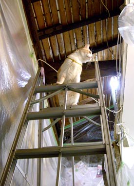 猫たちはビニ〜ルが楽しい。でも脚立のそばで遊ばれるのは怖い。 菅又は今日もため息をつきつき・・・がんばった。 ほぼ完成。 壁紙が完成してビニ〜ルを外すと《おお〜〜》。 まるで一部屋。でも天井が高いのでやはり部屋が小さい気が。 正味8畳分まるまると台所3畳と出部屋2畳・・・狭い。 体育館のような、温室のような家に住みたい。 正面窓を作るのをやめて、中2階を作って猫昼寝場所兼図書館にしようかな。 次は3階に取りかかるので、完成したらすぐこちゃ引っ越し。毎日3階で日光浴てつが困る。そうだ中2階だ中2階。 黒木和男の龍馬暗殺を流しながら更新。いい・・このモノクロがたまらん。ちゃんと封切りの時に映画館で観ている田崎。もう30年以上前の映画だぁ。浪人街のDVD欲しい。 昼・TSUTAYAついでに秀永、夜・田崎が作ったカレェとキャベツ山盛り。 【菅又の一言】・・・《やはり首が痛い。》 |