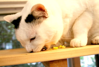 ![]() やっちはとうもろこしが大好き。 猫棚の上にちょっと置いたらかぶりつく。 |