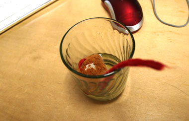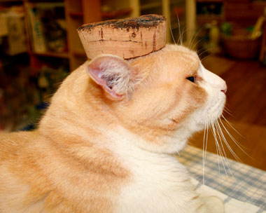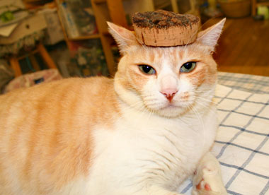 頭にコルク蓋を乗せるてつ。 |