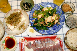 夜・雑穀米・天然ひらまさ刺身・小松菜と厚揚げと豚挽肉炒め・ザーサイ葱生姜の冷や奴・小茄子漬け・ちりめんじゃこ・挽き割り納豆。 |