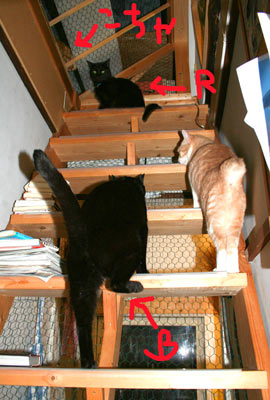 ![]() 今後の事を考えて時々完全隔離だった階段を開放。 ぶんたろ〜は毎日数時間は行っているので普通。 てつは・・・このあたりでうわぁと喚いて降りてくる。 さすけが・・・・しつこくただただ居座って睨んでいる。 こちゃは・・・偉そうにしている。 |