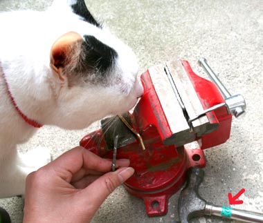 ![]() 作業していると猫たちが入れ替わり立ち替わり。 重たい万力・バイスで針金を叩き・つぶし、かすがいを作っている。 古くさい使い古されたように汚しているところ。 (矢印は2階用マーク・菅又が持っていかないように。) |