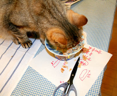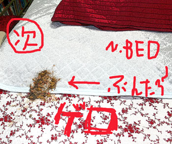 嘘、単に喰いすぎ。 冷蔵庫前に巨大ゲロ発見。 しばらくして近所のレンタルDVD屋に行こうと服を着替えに寝室に行ったら田崎BEDの上にまたゲロ発見。 くっそぉ〜〜〜〜と田崎セミダブルBEDのシーツ・下に敷いてある羊毛でか布団のカヴァ(昨日のIKEA赤ピンクの綿カヴァ)、 隣の猫場所BED上掛けとシーツ・・・巨大な4枚を取り替え。 -------------------------------- アメリカから来た巨大カヴァで田崎下羊毛をくるんでいたら。 急に暖かい、腕が。 てつがしっこをかけました。 このシーツにかけるのは4回目。 何故。何故ですか。 昔田崎母親が送ってきた中国産の羽毛布団にもしつこくかけたが、何か匂いが気に入らないらしい。 220×220の袋状。 田崎は大きな大尽気分のシーツとかカヴァは大好きなのだが、 カヴァーリングするとか洗濯するとか干すとか・・・結構な力仕事なのだ。 特に・・・・5.5〜6kgのだゆだゆ猫達と攻防しつつだし。 掛けたばかりでまた外すというのは、 すごく・・・虚しい気分。 カヴァーリング中にしっこを2回続けて掛けられるっては、 もの凄く・・・脱力気分。 漂白剤だけではなく香水とか酢とか・・・使うべきかぁ、でもその後その臭い消しに洗濯せねば。 そのうち使える日は来るのかぁ。しくしく。 ---------------------------------------- おまけ ![]() で、居間に戻れば1匹だけもの凄く喰うのが遅いだい猫が。 飯を押し出しているし。 |
