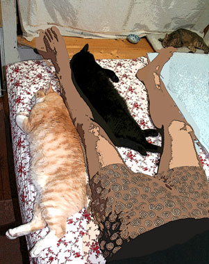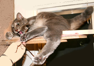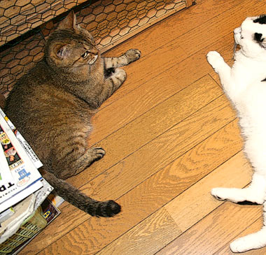 手、猫っぽくない。菅又は板橋に食卓直しと棚作り。 田崎はうだうだ。 前日の風呂タイル貼りで腰が痛くなった。 扇風機全開で低い風呂椅子に座りかがんでタイル貼りしていたのが敗因。例によって溶剤に負けて手は浮腫むし。 普段は手も足も浮腫むという事は一切無い。今回はこのタイルボンドで珍しく浮腫む。この溶剤ってばよほど血流の流れが悪くなるんだわ・・・。 など・・・ドライを掛けた寝室で寝たら座骨神経痛のように腿裏が痛んだので深夜2時に3階のこちゃ部屋に移動。菅又と寝場所交換。 先日の冷房で肩が痛んだときと全く同じ症状、でも腿の方が強力不快。うーんざり。 なので1日読書日だった田崎。 昼・インスタントカレェ、夜・雷雨に浮かれて馬場駅前とん久。 3階に寝たもんだから1日中さすけがぺたぺた、離れない。焼き餅焼き。 |