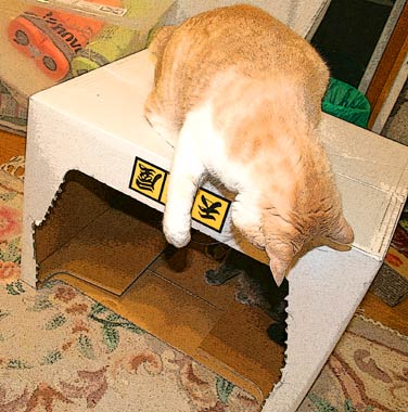 ![]() 今日はてつが先に箱を確保。 (実はさすけは最初から・・・中で段ボールを喰う事にしたのだ。) |