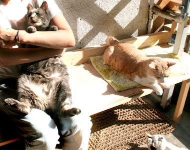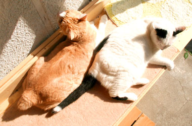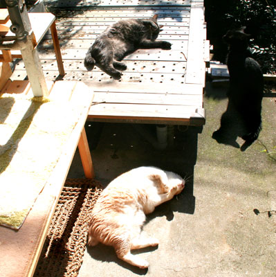 ![]() 昼に数時間日が当たる。 みんなで日光浴。 人間が行かないと猫共は室内で寝腐ったまま。 馬鹿ぁ。 |