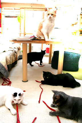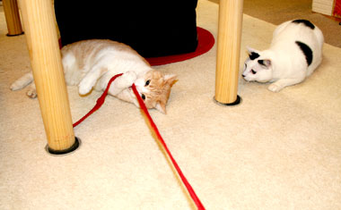 ![]() 外で遊べ外で・・。 昨日作り直した5m絨毯の不要部分紐でみんな遊ぶ。 1度に1匹ずつしか相手出来ない・・違うな猫が我が儘・・・すごく時間が掛かる。 |