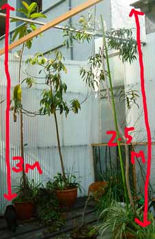 2/4 がぁぁぁ〜の植木切った。 左・ゴムの木、3E。半分に。 残りは40センチ位に小切り、花瓶・・。 (中・アボカド・切らず) 右・レモンユ〜カリ、2.5mを1.7m位に。 ともかくでかくなるなる。 |