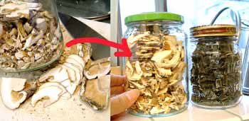 2/18 最新ではないが。 山ほど貰う《どんこ》は全部小さく切って、瓶。 利尻昆布も小さく切って、瓶。 汁にそのまま入れて、そのまま全部食す。便利。 |