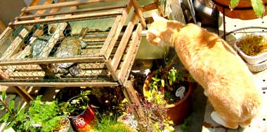 職人の昼寝の隣で和むてつ。大きなカッタ〜と遊ぶ。 ・・・。 ものすごく・・。 菅又も一緒に夏仕様に直す・物の入れ替え・絨毯洗いと片付け。 2階の庭というかベランダというか・離れの屋根・トタンが熱くてさすけがひ〜ひ〜泣くので・・板を張り巡らすとか。あちこち窓や天窓に布を垂らすとか。あまりに暑さに動物たちは大変。熱帯魚も熱すぎる。 といった夏な1日だった。 夜は菅又が1人で八広の菅又ママ宅に米届け、南砂ドイトで必要材買い物。 田崎は当然整頓片付け掃除。すぐに手がべたべたする・・泣く・・こちゃのしっこはべたべた。 さすがに今日は吐きそうだった。 服も何もかも捨てまくり。菅又の作業着も・新しいのは古道具屋行き。もう菅又建設の作業着はやめて欲しい、もっと今風のに変えて欲しい。 すんごく働いた田崎である。ぐた〜ぁ。 昼・カップ麺とインスタントカレェ、夜・難しい鶏カレェ/田崎作った/と大量サラダ(水菜とルッコラ)。 【菅又の一言】・・・《隔離部屋が拡大されたのでみんな走り回る。》 だい猫とこちゃ以外。さすけは上の穴から勝手に出入り、他の猫は扉の前で入れろ〜出せ〜ろ騒ぐ。 |