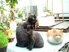 つ・爪研ぎ。 だいたいは巨大登り棒でみんな爪を研ぐ。絨毯はすぐぼろぼろで、しょっちゅう張り替え。冬終わり頃に安い絨毯をいっぱい買っておく。絨毯大臣・・。敷いてある絨毯でも爪研ぎ・・。 でも柱やら家具やらではしないのでいいさ。 今日の写真は親子写真ではないぞ。一見仲良し親子風なのが、けっこういや。やっとてつは黒い子供に慣れてきた。黒い物が怖いてつ。 先週頼んである硝子がまだ来ない・・・。あとは硝子を乗せるだけなのに。明日到着して、営業の前に設置できることを願う。 土曜から3階準備。階段から作るので、パソコン置き場を移動ってとこから始まる・・。部屋が明るくなったので、どこに置こうか頭が痛い。暗いところは寒いってわけだしさ。 【菅又の一言】・・・《明るいところははねて見にくいぞ、さあどうする。そういえばTVもすごく見にくい。》