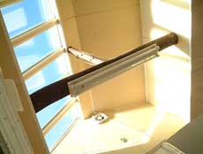 1年がかりで作った風呂〜。透明波板の天井と硝子ブロックの風呂〜。雨の日は雨音で、話し声が聞こえない楽しい風呂〜。朝のシャワ〜の時も背徳的に明るい風呂〜。 |