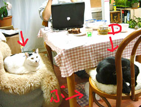 てつが大変。汚れている。 菅又が朝起きたら、屋根裏でがさごそ。大がさごそ〜〜。3階への扉が開いちまって、屋上ふさぎのプラベニヤもどけて、上に行ったらしい。 雨除け用にベニヤとブル〜シ〜トがかけてあるので、外には出ない。が、天窓周りの屋根裏をぐるぐる回って遊んでいたらしい。 途中でプラベニヤを誰かが階段に落とし、今度は2階に帰れなくなった・といったところ。 で、2階にはどnとてつが戻っていて、3階に閉じこめられていたのはだい・こちゃ・ぶんたろ〜。やっちたら、閉じこめられた3階階段から下に降りて、今度は1階玄関部分と階段に閉じこめられていたさ。 ・・・・・・・・・・・。 ・・・・・・・・・。 でも、足が屋根裏煤で汚れていたのは、てつだけ・・・?????????? 洗濯部屋の天井はまだ断熱マットを敷いていない部分がある。落ちなくて良かった〜〜〜〜ぁぁぁl。・・・・・・。 菅又が午後早くに大久保仕事から帰宅後、昨日のおぽんち基樹の・・足りなくなった分の壁紙買い。 西新宿で・・エクセル用スキャナソフト・・・とちょっとwindowsGame。 どnの薬貰いとだいの治療用カリカリやら毛カリカリやら身体に悪いカリカリも買う。さう゛ぁちゃnちのほた用にも買ったので、猫代だけで・・1万円・・・。