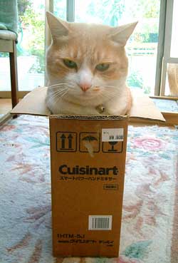 ![]() さすがに自分で入れなかったので、入れてやった。 詰まっていたので、箱ごととんとんとして、みっちり。 これは大受け、大笑い。他の猫が見に来たり、ぶんたろ〜が上から囓りまくったけれど、ふんふn平気、大得意。 ず〜とただ座っていた。 ・・・・。大笑い〜〜。 午後から横浜仕事。新しい仔猫もちょっと臆病で、ちょっとだけむりむり見た。大きい雄猫2匹は相変わらず気配も見せなかった。 登り棒設置。おしゃれなマンションが一挙に、ねこ〜〜〜な雰囲気に。棚を作ってコンセントを2口から3口に5組。久しぶりに普通のおしゃべりをして楽しかった田崎。 ごとう日なのに、行きも帰りも空いていて気分いい。 昼は途中で買い食い・神戸屋パン、が、いつもの高井戸ではなく、千歳船橋。油がロ〜カル気分・・・。高井戸と吉祥寺の方が美味しいぞ。夜・今から・・何だろう。タイ米だから、たぶn昨日の続き・角煮丼。 【菅又の一言】・・・《猫の爪研ぎ痕のボ〜ダ〜壁紙を作ったら売れるか。》