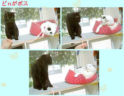 どnは『薬』っていうと、逃げる。3回目位で、すぐ掴まる所に逃げる。 苦いので、蜂蜜とまたたび粉を混ぜて、小さな注射器でぐいっと流し込む。 そのあと、《ひょひょひょひょ〜》と遊んで貰う。 お気に入りの場所に走っていって、爪をばりばり、菅又に背中を叩いて貰ったり、空中浮遊して貰う。 だから、薬時間は、いや・・でも楽しい・らしい。 猫も微妙。 付。 やっちは誰のどんな薬でも好き。 『おくすり』と言っただけで、何でも喰う。 普段は動物用ビオフェルミンをぽりぽり。 これはいざとなったら人間も飲めるだろうし〜便利。こちゃとぶんたろ〜は気が向いたらぽりぽり。 ぶんたろ〜は勧めると一応何でも一口食べる。でも口の端からぽろぽろ落としたり・・。 でもやっちは、さすがに今回のどnの薬は苦すぎて、最初に一舐めしただけで、今はいらないそうだ。 |