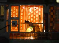 左・店から見える猫階段。こちらを覗いているのは、だい。 右・新聞の上に寝るやっち。重くて抜き取れない・・。 |