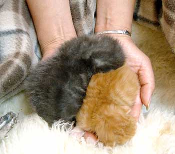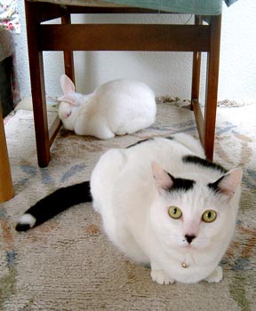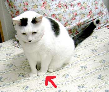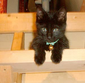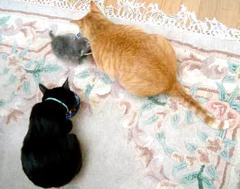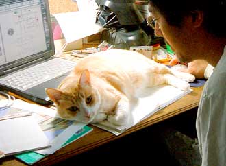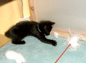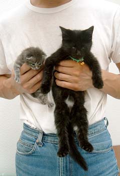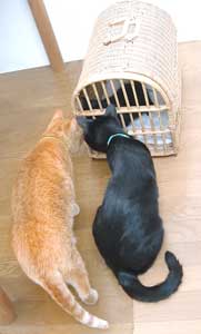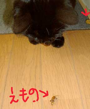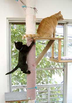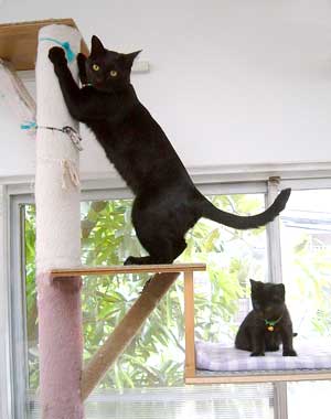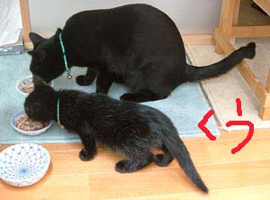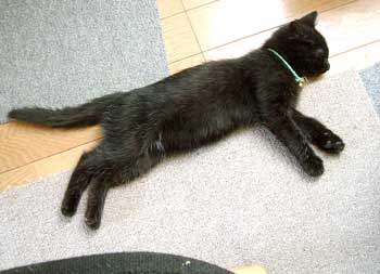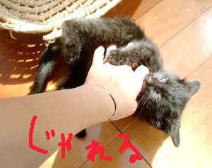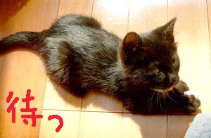 で、田崎猫。黒猫。すごく渋い。手もでかい。おっとり。 全身に白い毛が飛び出ていてすごく格好いい。ちょっと毛がさわ〜。声は迫力。 3階に一応落ち着いている。他の猫は入れないようにして時々連れて行って様子見中。だい猫は無視、やっちはけぇ〜〜、こちゃは・・・はぁ〜〜っ(まったく〜)。 で、てつは、ぶんたろ〜かどnと思っているらしく、気にしていない。 うんこもしっこもきちんと猫トイレで2回ずつ。猫缶もぱくぱく。鈴付き首輪も全然平気。 田崎腹にくっついて昼寝。 鼠とか羽のねこおもちゃでじゃらすと、遊ぶ遊ぶ。すごく元気良く遊ぶ。腹をなでると喜ぶし、手も嘗めてくれるし、本当にいい子。決して爪を出さないのもえらい。 今はもう4時間ほどぶんたろ〜と追いかけっこ中。 未来のボス猫。