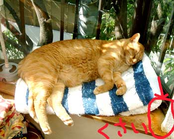 こちゃはもう平気。 近寄ってくると舐める。大人猫達は、龍のすけとさすけと、そこそこ区別しているようだ。概してさすけは無視。 菅又は小平でバレェ稽古。 ・・・。 さっき菅又分をパソコンに入力しようとしたら、全然分類分けが出来ていない。この1週間・・・。 がぁぁぁぁぁぁ〜〜。 いやいや、ちゃんと指示して見張っていなかった田崎の自業自得・と考えて気を静めよう。 今日明日の怒濤の怒りは時間の無駄だ。何としてでも明日提出だ。 この16〜7年遅れて提出は無いのだ。 今夜まだまだまだ。入力してからの全集計チェックが地獄なのだ。細かい書類を作ってプリント、税務所用書類に書き込み、ってので本当は1日半必要。でも今日も今日とて、色々事情があるのだ我が家は。 昼間はあまりの暑さに、猫達はひ〜ひ〜云うし、ちび共ははぁはぁするし。 結局さすけは田崎足下に置いて、首振り扇風機で様子見。ぶんたろ〜は外の涼しい所に避難していたので、つまらない龍のすけは田崎の所に来て遊ぼう遊ぼうと鳴くし。勿論期待は裏切れない。 つまり、すべて要領悪く遅い菅又が悪い。この落とし前は後日高くつくだろう。 昼・冷麺、夜・ポトフと焼き鰹とサラダ。 【菅又の一言】・・・《くそ夏。》