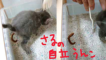 毎日魅惑の黒猫軍団。 というか・・・。人が寝た直後の深夜とか、明るくなった早朝とか、ものすごい騒ぎ。 大運動会を2匹でしている。 だから昼間は静か。ちょっとは。 ぶんたろ〜は段々うまく相手出来るようになってきて、楽しい。 さすけもいっしょに3匹で遊んでいるのもおかしい。 黒猫2匹はちびも遊んでやって本当にいい子。 龍う太は勧めると何でも食べる。どnとぶんたろ〜と同じ。本当に好きなのか、お愛想なのかわからないが、どんなものでも2口は食べる。かわいい。 いつどこでかまってもぶつぶつ喉をならすし、呼べば来るし(気づけば)ああ〜〜もうかわいいったらありゃしない。 最近はぶんたろ〜の黄色いボ〜ルとか田崎が丸めてやる新聞ボ〜ルで遊ぶ。時々持ってくるし。・・・ぶんたろ〜は隙を見てボ〜ル遊び。でも互いに相手のおもちゃが気になって、すぐまた軍団になる。 ぶんたろ〜は隣でうたた寝、今夜の準備中。 今日も店塗りをしていたが、ああ〜猫共と遊びたい。 結局商品が間に合わなくて手薄になるわけだ。 昼・ピザと肉まんとハッシュドポテト(冷蔵庫掃除)、夜・ワンタン入り喜多方ラ〜メンとランチョンミ〜トの野菜炒め。 【菅又の一言】・・・《作り作ったテ〜ヴルと椅子。》 月・火・水・木・・あと4日。どこまで進められるか、どきどき。買い物も山程あるし。 ![]() 問題の猿のうんこ。 固いので立つ。 うんこがケチなさすけ。 |