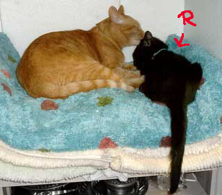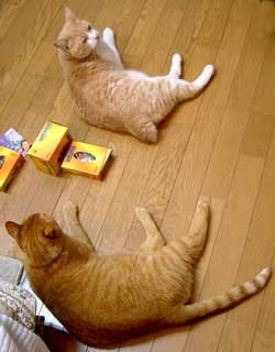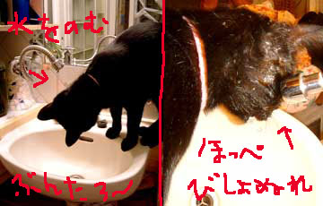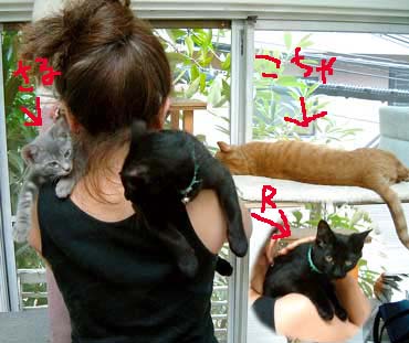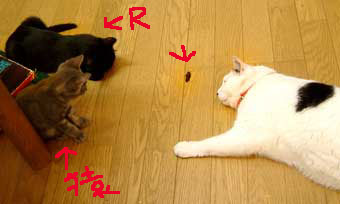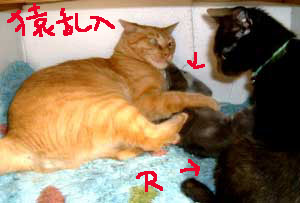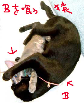 こちゃはぶんたろ〜と龍う太には優しい。龍う太は舐められて、べちゃべちゃ。 |