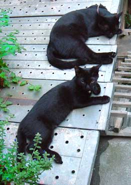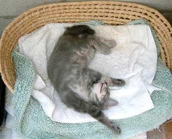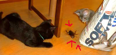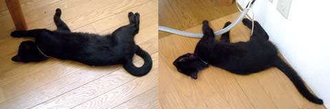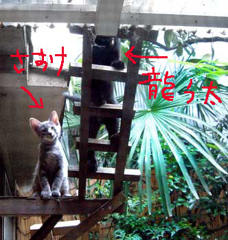 ほら黒猫軍団は似ている。全く似ている。 どnとぶんたろ〜コンビよりもこっちのコンビの方が似ている気がする。どっちも毛がてらてらしているし、手足の伸び具合が。 龍う太は身体がしっかりしてきて、嬉しい。よく食べるし。大食いは男らしい。呼ぶと返事をしながら来るし、ああ〜〜かわいい。 【猫のちゅくについて】・・・2ヶ月くらいまで母猫といると満足できるらしく、《ちゅくちゅく》をしない。(毛布とか柔らかい物を手でもみもみして吸う事。) 目がやっと開くくらいに拾った猫達は・・だい猫はくわえてもみもみ、やっち・どn・ぶんたろ〜・さすけはちゅくちゅくもみもみ。 ちゅくをしない・・・てつは2ヶ月近くまでシャム猫のお母さんに可愛がられ、こちゃはどnがいつも舐めて面倒を見ていた、龍う太も2ヶ月位まで母猫と一緒。 だいとさすけはふわふわしていれば何でもいいようだ、やっち・(どn)・ぶんたろ〜 は決まっている。時々洗濯しないと臭い。 でも龍う太は垂れ垂れ。夜や朝田崎懐でタオルケットに潜り込んでぬくぬくごろごろ。あああ〜どうしてこんなにかわいいのかしら、龍う太。 菅又は朝から1日井荻で外仕事。で、また増やしてきたらしい。感謝・・。 田崎はあちこち残務整理と片付け・・・・。ふぅ〜暑い。14時・居間36度、寝室32度。 今日はク〜ラ〜つけず。さすけが時々ひぃひぃ云っていたが、冷たい牛乳で我慢して貰った。今回の龍う太とさすけは人間用の冷たい牛乳もがんがん飲む。生活クラブの牛乳は健康安全らしいうえに、すごく旨い。猫と分けっこ。 昼・田崎はお茶漬け三昧(菅又は不明)、夜・しこたまゴ〜ヤチャンプル(でも牛肉で作ったらいまいち)とトマトレタスサラダ山盛りと汁。 【菅又の一言】・・・《なんて涼しいの。》 身体が馬鹿。だって今34度なのに。