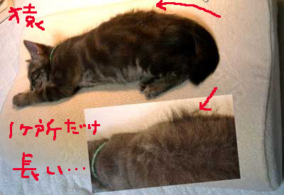 全身あまりの毛の短さに、田崎びびった。尻尾から毛が長くなっている。ほっ。 でも背中の毛がむらむら長い。非常に不審。この3〜4日急に1カ所だけ長くなってきてる。モヒカン・・。 毎日田崎テンピュ〜ル枕を分け合って寝る。目を開けるとさすけの長い顔。段々すごくかわいい気持ち。 見るたびおおっとなって楽しい。 (以前より問題だった・・・って田崎1人が騒いでいたのだが・・もし我々がセパレ〜トしたら、猫をどう分けるか・・ 田崎はちび3匹軍団に決定。 菅又は・・だい・てつ・やっち・こちゃ・・・。考えただけで頭痛・・。あははは。 |
