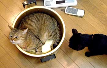 だい恒例の《なべ》。![]() 鍋鍋というと必ず入る。好きらしい。涼しいし。 得意顔・・。他の猫は不審がる。 すごいぞ暑いぞ。田崎Macはすぐ固まる。 何て云ったって、39度だ。熱暴走だ。当然だ。 いくらMacあて扇風機を回しても、暑い空気が掻き回されるだけで、温度に変わりはないからね。 今後もっと気温が上がるようなら、Bookを復活させて、ク〜ラ〜部屋(猫部屋とも動物部屋とも云う)で更新せねばならぬ。 菅又は何やら工具の補修とか見積もり書きとか見積もり届けとか、1日多忙に汗を振りまいていたようだ。金穴又や堂〜。当然だな外仕事をしていない。・・・。 夜も全く気温下がらず。22時で37度。・・・。先ほどあまりのことに車で早稲田方面に涼みに行った。女店員のとろいモスバ〜ガ〜で田崎が試してみたかった《チョコモカなんとか》を飲んで、本屋。温度のことを考えずに済んだ一瞬。 で、今から夕飯は《ユッケジャンクッパ》インスタントス〜プに雑穀を入れて食す。汗だらね。 昼・夏恒例の豚冷しゃぶと水菜胡麻サラダ。 【菅又の一言】・・・《暑中お見舞い申し上げます。》 お〜よ暑中見舞いを印刷しよう。