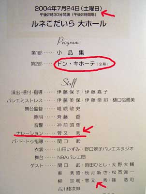 何だか、顔というかおでこというか、長い。 エイリアン頭と呼んでしまう。わたわた。どんどん。 井荻の打ち合わせやら2軒してからルネ小平稽古。 打ち合わせが遅いから車で待っていた田崎は熱中症で死ぬところだったよ。年寄りは危ないのだよ。 17時〜22時半・・・。遅い遅すぎる。前日なのに。 菅又はまだら惚け爺ぃなので、なかなか困難。話しに整合性が・・・。ちょっと困っている菅又。でも稽古少なかったし楽したから、本人の気持ちの問題は置いといて。 今回は難しいことがあまり無く、殆ど長くいる生徒さんで・かつなかなか中堅と云うことで、及び、ゲストのメイン男衆が楽しく、そう、けっこう堅実によくできている。 菅又は惚け爺ぃだけど。 ただ菅又は普段からO脚内股なので・・・心苦しい。稽古不足で足先まで心配りが出来ていなので、田崎にどつかれていた。明日はどんなもんだか。でも惚け爺ぃ。 あっ、眠くて。ク〜ラ〜負け。 昼・インスタントカレェ、夜・小屋で出た夕飯(茶巾寿司セット)を帰りの車の中で。 【菅又の一言】・・・《色惚けロリコン爺ぃ。》