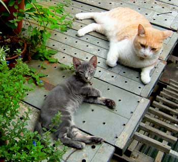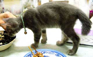 最近はなかなか慣れてきて仲良し、てつとさすけ。 色目がぼ〜としたコンビの2匹。さすけがてつをがふがふ襲っていること多々ある。やっとてつはぎゃ〜ぎゃ〜云わなくなった。 でもてつは、黒猫には一切云わなかったので、面白い。黒猫は誰でも平気なのね。たぶn・・・どnとぶんたろ〜と龍う太の区別は全然無いのだ。さすけのことは最近までちょっとけぇけぇだった。 夜中うるさい。3馬鹿はひたすら夜中じゅう運動会。菅又によれば毎朝6時にはさすけが菅又両足を喰うらしいし。 3匹でどたどた追いかけっこか、からから鳴る鼠おもちゃで取り合い遊ぶ。どたどたどたどた・・・か・・からからばたばたからから・・BEDの下で。 で、また猫の裏をかく。3階に引っ越し。って、暑いと3階に寝られないんだけどね。ちょっと夜中は涼しくなってきたのと、昼間の湿気で猫便所蒸して臭いぞ。菅又君!! ということで、3階の猫便所は撤去してしまって、心おきなく寝る予定。2階も扉の向こうに猫便所があって・・・臭い。ああ〜〜いや。どんなに掃除していてもくそ暑い蒸し蒸しだと臭うのだ。田崎はすごく鼻が良いし。夜中に目が覚めてしまう。 ・・・実は3階は今現在、南側が丸見え。廃屋解体で全く丸見え。明日は休日なので今晩は良しとして、明日対策を講じよう。 廃屋のユンボ工事終了を待って、夕方井荻に打ち合わせ。来週は偽漆喰宅で、いよいよ仕事場周りの大工工事。本棚作りとか机。 昼・冷やし中華、夜・尾道ラ〜メンと焼きそばと鶏サラダともずく(今日の最新に画像あり)。 【菅又の一言】・・・《ちょっと涼しくなった気がして、出かける気になっているだい猫。》 階段扉前でひ〜ひ〜云っていた。でも車の中はエンジン熱でまだまだ暑い。だめだわ。 追加・・・今日の3馬鹿おまけは別ペエジ・・・ここ。 |