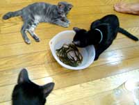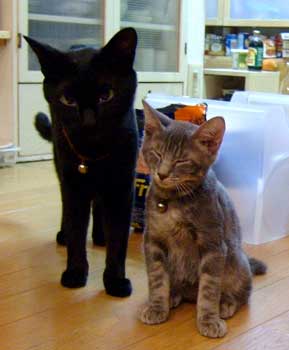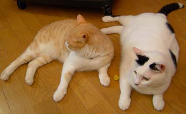 ぼ〜とした色の兄弟はちょっと仲良し。 でも見つけられなくて大声でさすけを呼んでしまったよ。黒猫の伝統に則って、田崎が大声を出すと龍う太が必ず来る。小声で呼んでもいつの間にかちゃんと来ている。でも普段はまったく鳴かないので気づかなかったりして・・。 最近、夜はちび2匹は1回の中庭で虫遊びらしい。 そうそう、先日走り回っていた龍う太が少し水の入っていた風呂に落ちて濡れたが、今日はさすけがわざと飛び込んだ。龍う太はとても大人しく拭かれて楽なのだが、さすけは大騒ぎ。あげくにだいぶ直っていた痛い脚がまたちょっとひどくなっている。引きずっている。元気乱暴反抗期小僧。 でもガキ2匹は毎日毎日ものすごい量の粉ミルク飲んでいるさ。カルシュウム。 菅又は働いていた。田崎の要望注文もこなしてくれた。 夜はまた餅米半分のおこわを作った。2カ所にお届け。何故ならば、色々食べたい。1度にいっぱい食べたいのではなく、いろんな種類。でもせめて4合か4合半は炊いた方が美味しいので、いっぱい炊いてみんなにも食べて貰う。 吉祥寺の駅ビルス〜パ〜に電話してどじょうのことを聞く。注文。5袋分注文した。明日引き取りに行く。 おこわ届けながらDVD借りてきた、人に云えないような洋物馬鹿ホラ〜3枚。 昼・クスクスとサラダ、夜・鶏五目おこわと糟漬け紅鮭とキャベツの大蒜味噌と卵汁と豚挽き肉と葱満載のタイ風卵焼き。 【菅又の一言】・・・《今日はやっちの代わりにてつがキ〜ボ〜ドに寝ている。》 何故ならば・・やっちは田崎隣にいるから。それは・・ぶんたろ〜が食卓で熟睡してしまったから。・・・。
