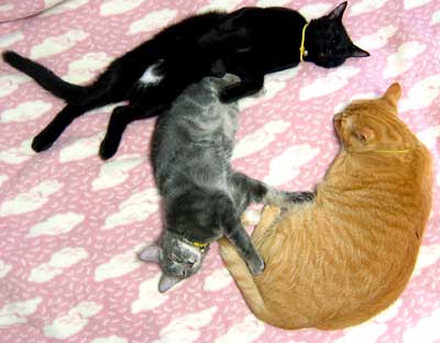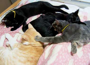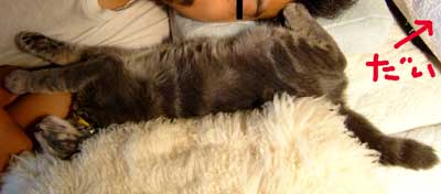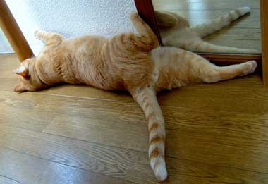 さすけは実はちょっと嫌われ者。 せっかく通りすがりの大人猫が舐めてくれても、すぐばほばほ反撃。やっちもこちゃもぶんたろ〜も龍う太も一生懸命舐めてくれるのに、がぅがぅとかばしばし。自分が寝るのに飽きると、他の猫が寝ている隣に潜り込んでがほがほ、元々いた猫達はいやになってどこかに移動してしまう。困ったもんだ。みんなで寝場所点々。 涼しくていいのぉ〜。 色々作業がはかどって嬉しい。さくさく気分。 菅又はまたまたぶ兎移動小屋作り。照明引き上げと荷下ろし。猫缶買い(バ〜ゲンだったのでいっぱい買った、恐ろしい量買った・・)。 2階の寝室に戻ってきたら、雨音は遠のいたが、朝早くに起きなくていいのが楽。寝ていられないほど眩しくならないからさ。 でも猫達が田崎にのしかかって重い季節とも云う。龍う太がいつも1番に良い場所にいる、田崎左足脇。脚の間に、ぶんたろ〜かさすけかこちゃ。寒いと龍う太。 秋眠。もう眠い。 昼・さんまとか、夜・焼き鳥食べているがこのあとさんまと茄子焼きも食べる予定。 【菅又の一言】・・・《冬。》 |