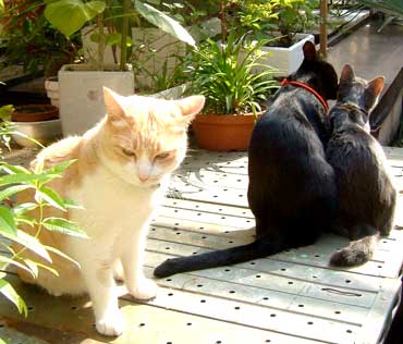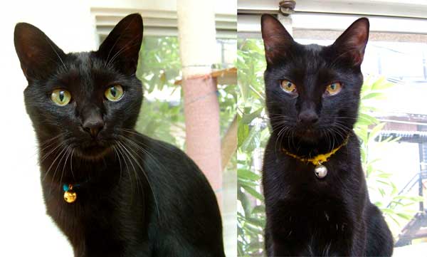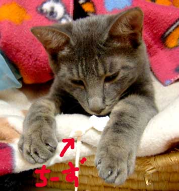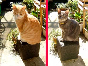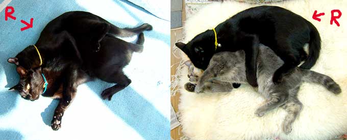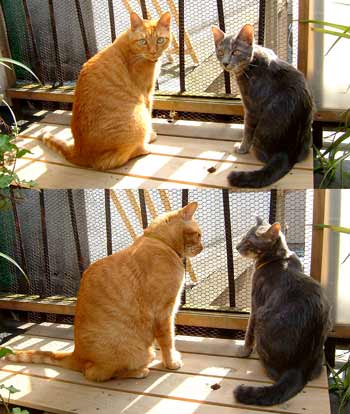 ちょっと牽制。でもさすけ・・でかくないか〜〜??我が家の1番でかでか・こちゃに比べてさほどちびくない・・。 でも顔の造作の違いが際だつ2匹。こちゃは1番丸くて耳も顔の中に入っている、鼻も丸くてしゃくれているし。さすけは耳は顔の外・輪郭の外に・・鼻面なんかまっすぐだ〜〜。 |