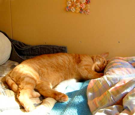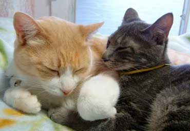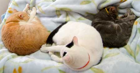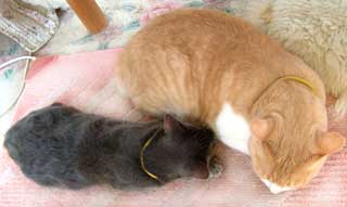 ぶんたろ〜はさすけがお気に入り。さすけはべったり寄りかかっているな。 一昨年はてつ・どn・ぶんたろ〜で似たような光景をよく見たな。 でもこの3匹だと親子に見えないけどね。 (朝起きたらまた首輪がなかったので、やっちの古いのを借りにつけているぶんたろ〜・似合わない) |