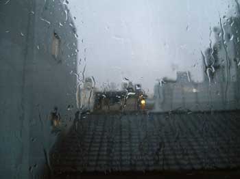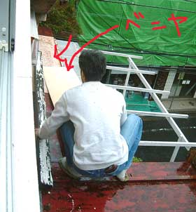 土砂降りの中、東の出窓部分の雨漏り緊急補強。 |