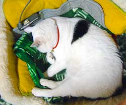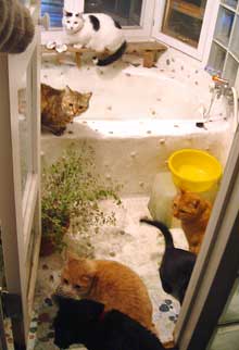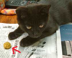 う・ううううううううううう・・・。![]() そういえば昨日、映画館で007の予告。やはりMacの中で見る予告より大迫力。007は大画面の映画館で観ないとつまらないぞ。今回は予告は地味だが、監督はリ〜・タマホリ、《ワンス・ウォリアーズ》《狼たちの街》など男っぽい骨っぽい映画を撮るのですんげぇ楽しみ。 今日は寒かったので地味。 菅又は緊急電気工事。 鯖ちゃnちの、先日壊れて大騒ぎ〜の、取り替えたエアコンの電気配線。巧く組み合わせないとブレ〜カ〜が落ちる。掃除機かけて落ちるとか、ト〜スタ〜で落ちるとかしたら大変だろ。外の寒い壁にスパイダ〜マンのように張り付いて工事していた。 昼頃外が寒いと、家の中は大変。遊びたいぶんたろ〜、じっとしていたい大人猫。 じゃれついてしょうがないので、けばけばモ〜ルを丸めてやったのを投げて、《持ってこい》遊びをする。 やっち以外はみんなするのだが、特にぶんたろ〜は一番すごい。部屋のあちこちに投げると、机の上の田崎の真ん前に持ってくる。投げる・持ってくる/投げる・持ってくる/投げる・持ってくるを50回以上立て続けにする。食事をしている田崎に持ってくる。飯腕の中に、汁碗の中に、お茶 の中に、わざわざ入れてくれる。あまりの素早さによける暇も無い。猫の母は疲れたさ。 工事している鯖ちゃんちで昼食べさせて貰った。新しいオ〜ヴンレンジでパン焼き。鯖ちゃんはパン焼き名人。ぱくぱく。 今から安い豚肉の《角煮・卵入り・冷凍隠元添え》丼を抱えて、ヴィデオ。昨日の《オ〜スティンパワ〜ズ・ゴ〜ルドメンバ〜》面白かったよ〜ん。トム・クル〜ズがへん〜〜。 【菅又の一言】・・・《エアコン屋さんは電気工事をしてくれなかったので、儂がやっている。》