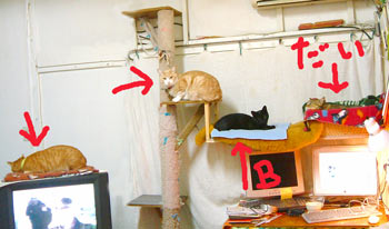 てつが大変。汚れている。 菅又が朝起きたら、屋根裏でがさごそ。大がさごそ〜〜。3階への扉が開いちまって、屋上ふさぎのプラベニヤもどけて、上に行ったらしい。 雨除け用にベニヤとブル〜シ〜トがかけてあるので、外には出ない。が、天窓周りの屋根裏をぐるぐる回って遊んでいたらしい。 途中でプラベニヤを誰かが階段に落とし、今度は2階に帰れなくなった・といったところ。 で、2階にはどnとてつが戻っていて、3階に閉じこめられていたのはだい・こちゃ・ぶんたろ〜。やっちたら、閉じこめられた3階階段から下に降りて、今度は1階玄関部分と階段に閉じこめられていたさ。 ・・・・・・・・・・・。 ・・・・・・・・・。 でも、足が屋根裏煤で汚れていたのは、てつだけ・・・?????????? 洗濯部屋の天井はまだ断熱マットを敷いていない部分がある。落ちなくて良かった〜〜〜〜ぁぁぁl。・・・・・・。 菅又が午後早くに大久保仕事から帰宅後、昨日のおぽんち基樹の・・足りなくなった分の壁紙買い。 西新宿で・・エクセル用スキャナソフト・・・とちょっとwindowsGame。 どnの薬貰いとだいの治療用カリカリやら毛カリカリやら身体に悪いカリカリも買う。さう゛ぁちゃnちのほた用にも買ったので、猫代だけで・・1万円・・・。