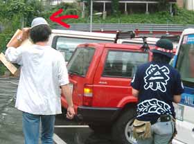渋谷で雨に降られたので、買ったプラスチックボ〜ルを帽子変わりに被る菅又を大受けする祭り半纏もりもっちゃnの図。 |