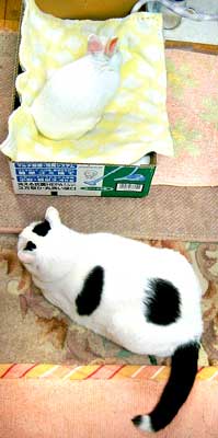 もうこんな季節か〜? 田崎椅子の下、被いをかけて足用ちびホットカ〜ペット。さっきはてつ・どn・ぶ兎がいだきあっていた。 夜、こちゃは田崎脚元と懐いったりきたり。でも抱いて寝るとまだ暑い。 菅又は近所の外仕事予定が、雨で順延。 どnの薬が無くなった。荻窪獣医さnと電話で話し合って、どnを一応連れて行くことに。こちゃに付き添って貰うことにして、無理くそBedの中から引きずり出して車に。でも男らしいのでまったく気にせず、乗ったとたんうんこしっこ。 どnはちょっと体重が軽いのだが、元気ということで、抗生物質とステロイドを飲ませていたのを、ステロイドのみ1日置きに。ちょっと安心。 一旦帰宅後、食材買い。新宿高島屋とハンズ。 今日も低気圧でちょっと頭痛。めまいもいやね。 その後・・・部屋の掃除。でも車に乗って不満気分・甘ったれ気分になっているどnがすぐに抱っこ抱っこと鳴くので、なんだかな〜、の夕方夜だった。 昼・高島屋ペックのサンドイッチと鯵の寿司買い食い、夜・ハンバ〜グとカリフォルニアサラダと玉葱ス〜プ。更新終わったらゲ〜ムか・・。田崎はすでに眠い・・・・。 【菅又の一言】・・・《昨日の雨が遅刻してきた。》